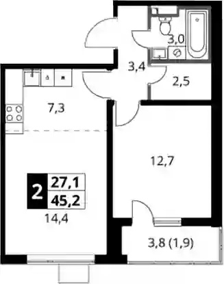 9 863 396 ₽2-к.квартира, 44.4 м², 19 эт.
