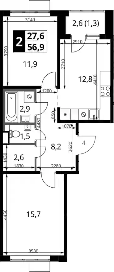 8 947 467 ₽2-к.квартира, 52.9 м², 2 эт.