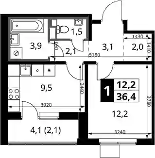 6 539 105 ₽1-к.квартира, 36.9 м², 3 эт.