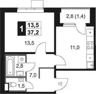 6 614 142 ₽1-к.квартира, 37.2 м², 4 эт.