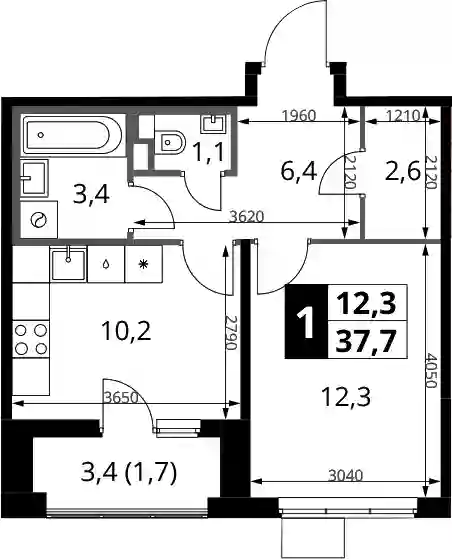 6 544 630 ₽1-к.квартира, 37.2 м², 2 эт.
