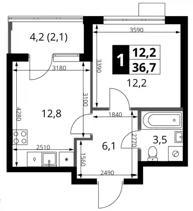 11 790 603 ₽1-к.квартира, 36.3 м², 4 эт.