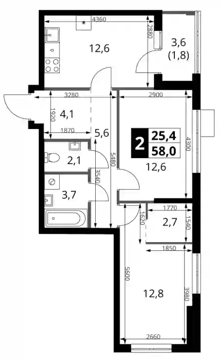 15 526 113 ₽2-к.квартира, 58.4 м², 5 эт.