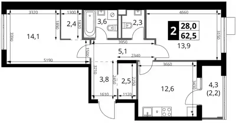 21 476 810 ₽2-к.квартира, 63 м², 14 эт.