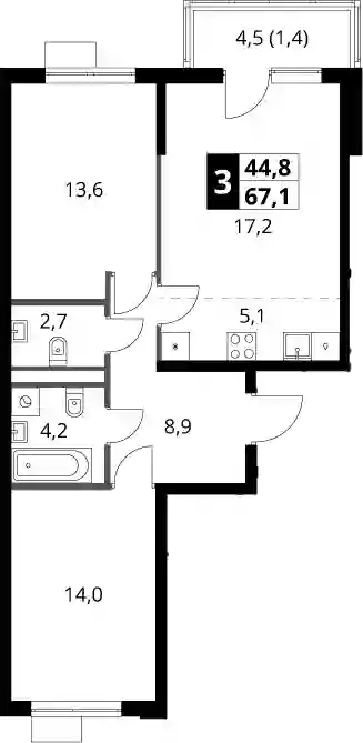 3-к.квартира, 65.7 м², 6 эт. в ЖК 1-й Ясеневский Корпус 1