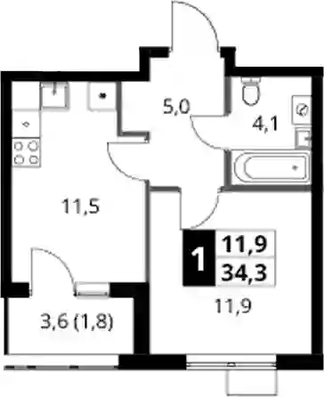 11 644 524 ₽1-к.квартира, 34.3 м², 2 эт.