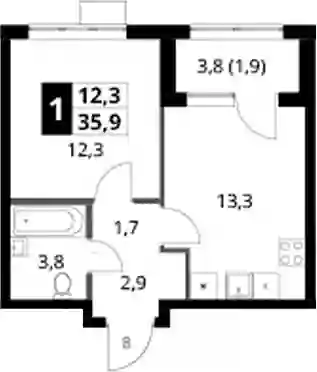 12 390 224 ₽1-к.квартира, 34.7 м², 2 эт.