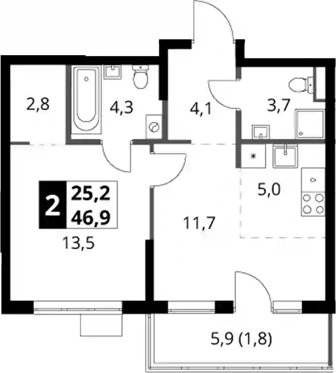 13 869 117 ₽2-к.квартира, 46.5 м², 18 эт.