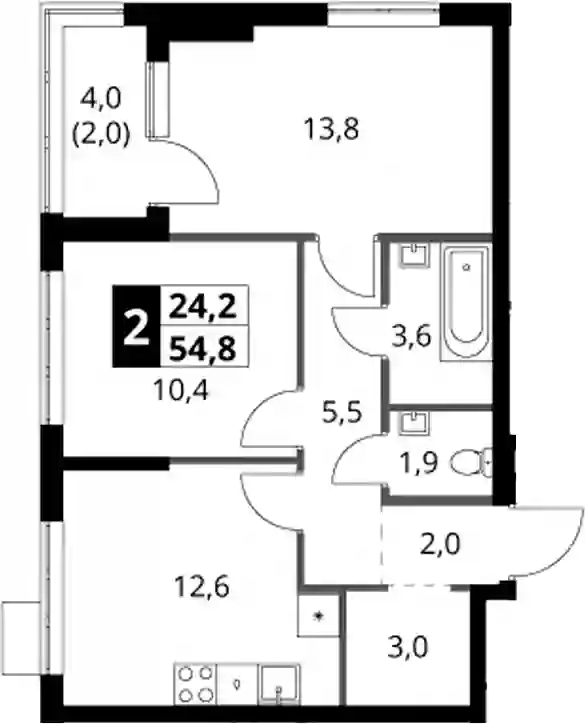 14 989 824 ₽2-к.квартира, 48.6 м², 4 эт.