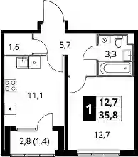 14 095 798 ₽1-к.квартира, 36.3 м², 3 эт.