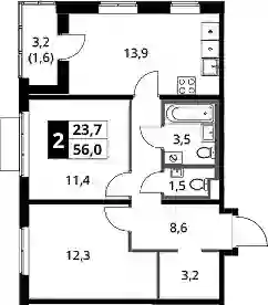 19 956 456 ₽2-к.квартира, 56.2 м², 3 эт.