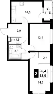 14 051 385 ₽2-к.квартира, 57.9 м², 2 эт.