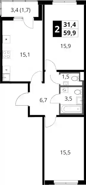 20 863 084 ₽2-к.квартира, 54.6 м², 15 эт.