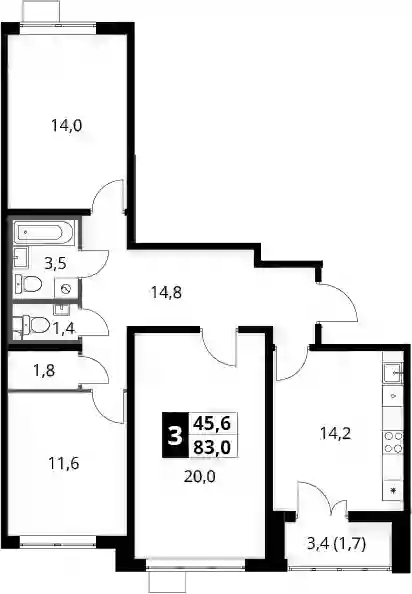 3-к.квартира, 82.3 м², 20 эт. в ЖК 1-й Южный Корпус 1.2
