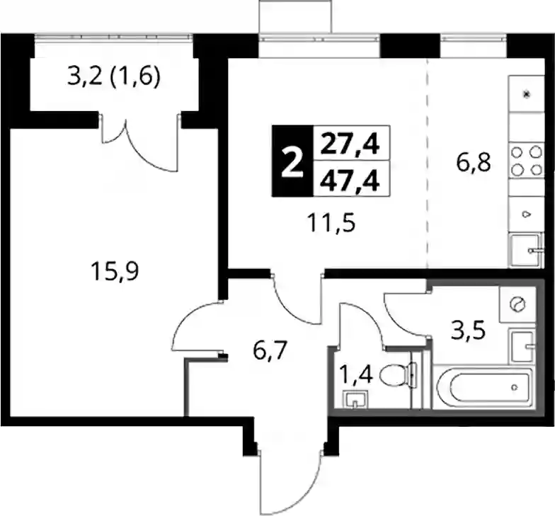 14 466 480 ₽2-к.квартира, 45.8 м², 15 эт.