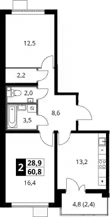 14 186 904 ₽2-к.квартира, 57.3 м², 4 эт.
