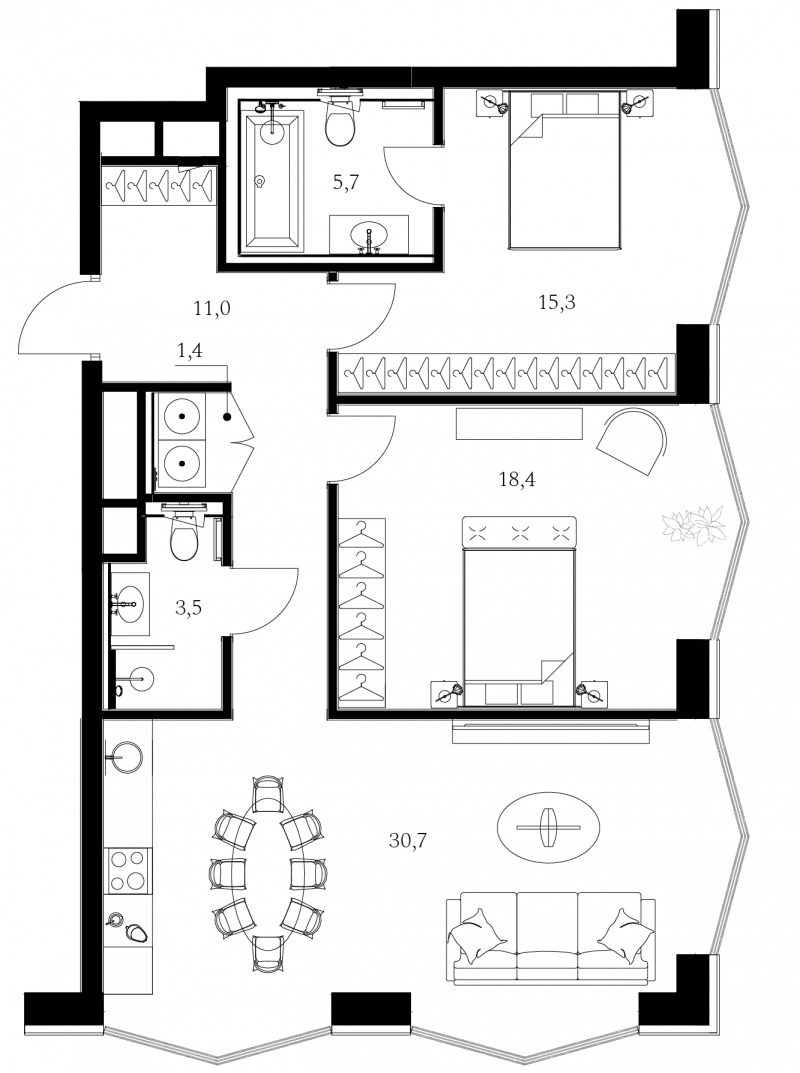 В проекте предлагаются премиальные апартаменты с 1–3 спальнями, а также пентхаусы с террасами и дровяными каминами. Все помещения имеют панорамные окна, в ряде планировок предусмотрены окна в ванных комнатах. Высота потолков варьируется от 2,95 до 3,25 м. Отделка выполнена в формате whitebox: стяжка с шумоизоляцией, оштукатуренные и зашпаклеванные стены, потолок из гипсокартона, проведена электрика, водоснабжение, отопление, установлены подрозетники и фанкойлы. Возможен дозаказ дизайнерской чистовой отделки.