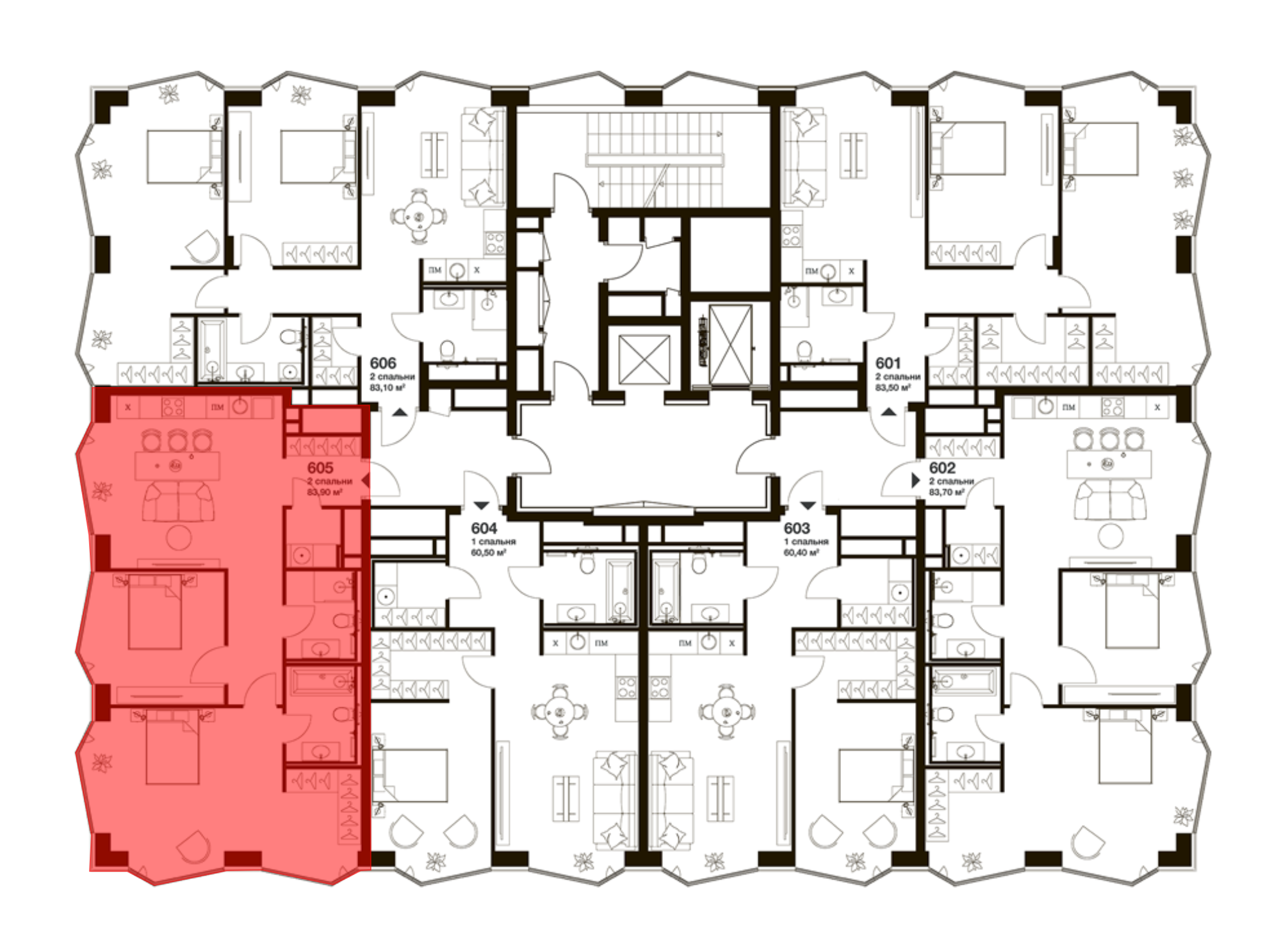 Жилой комплекс состоит из 5 особняков переменной этажности от 5 до 9 уровней. Дома возведены по монолитной технологии с фасадами из юрского мрамора и металлической отделкой окон. Архитектурная концепция разработана бюро Цимайло Ляшенко и Партнеры. Каждое здание оснащено пассажирским и грузовым лифтами, минималистичные входные группы оформлены в спокойных тонах и дополнены зонами отдыха.