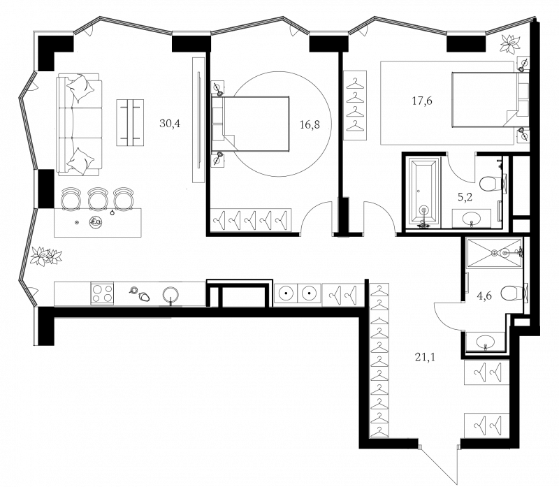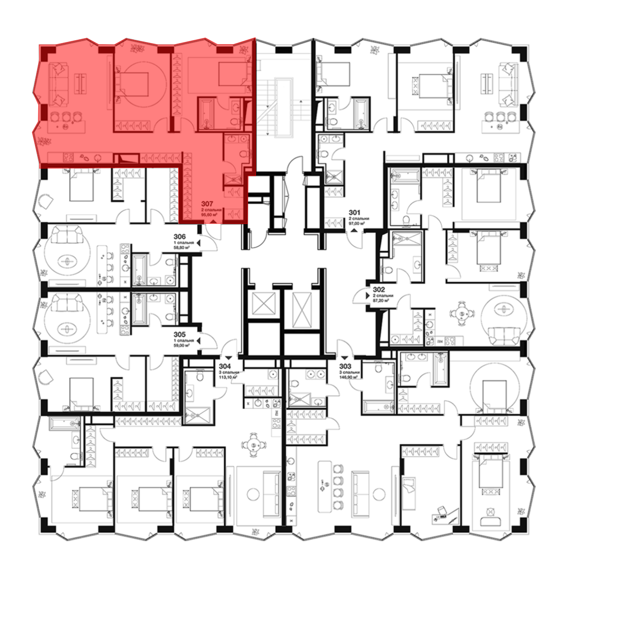 В проекте предлагаются премиальные апартаменты с 1–3 спальнями, а также пентхаусы с террасами и дровяными каминами. Все помещения имеют панорамные окна, в ряде планировок предусмотрены окна в ванных комнатах. Высота потолков варьируется от 2,95 до 3,25 м. Отделка выполнена в формате whitebox: стяжка с шумоизоляцией, оштукатуренные и зашпаклеванные стены, потолок из гипсокартона, проведена электрика, водоснабжение, отопление, установлены подрозетники и фанкойлы. Возможен дозаказ дизайнерской чистовой отделки.