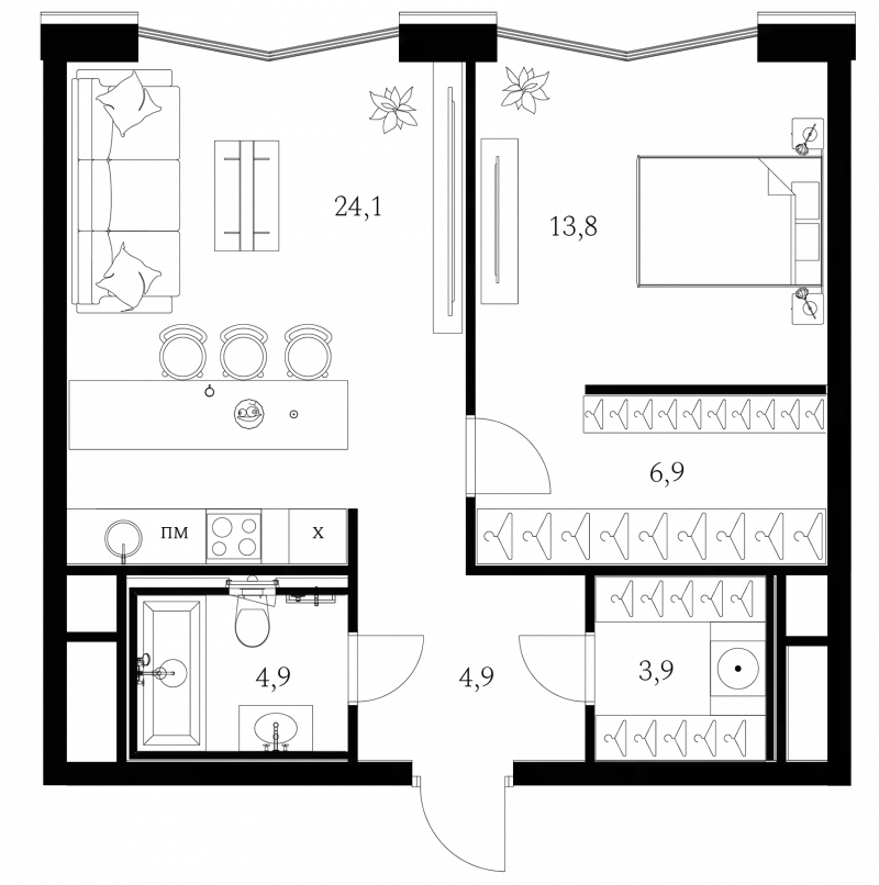 В проекте предлагаются премиальные апартаменты с 1–3 спальнями, а также пентхаусы с террасами и дровяными каминами. Все помещения имеют панорамные окна, в ряде планировок предусмотрены окна в ванных комнатах. Высота потолков варьируется от 2,95 до 3,25 м. Отделка выполнена в формате whitebox: стяжка с шумоизоляцией, оштукатуренные и зашпаклеванные стены, потолок из гипсокартона, проведена электрика, водоснабжение, отопление, установлены подрозетники и фанкойлы. Возможен дозаказ дизайнерской чистовой отделки.