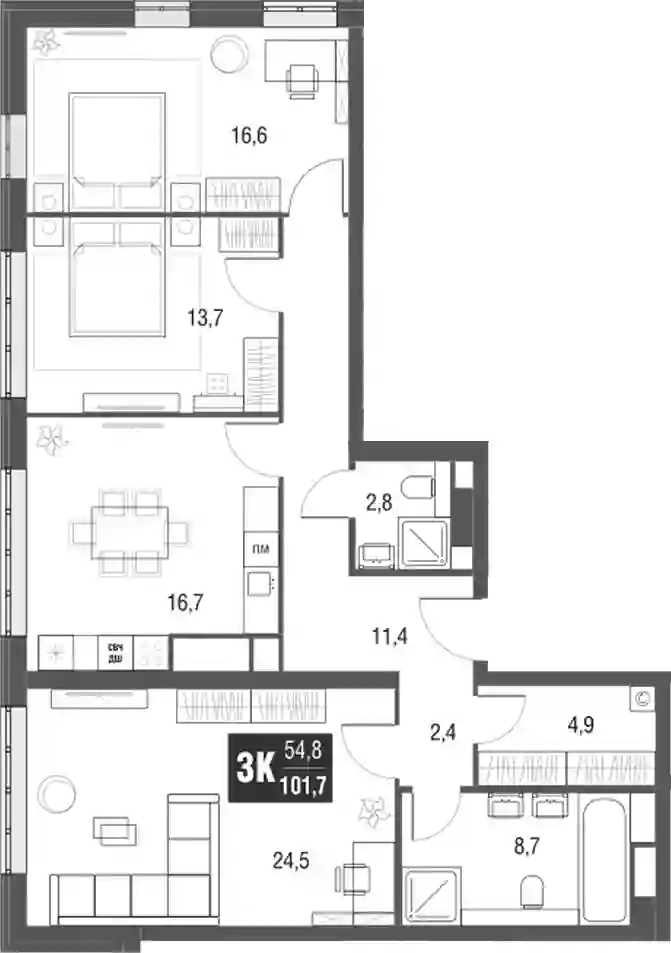 В небоскребе 1216 квартир, из которых 910 студий. Размер лотов варьируется от 19 до 105 кв.м, высота потолков в них составляет 3,3 м. Каждая квартира имеет возможность оснащения системой «Умный дом», которая позволяет управлять бытовой техникой и приборами по Wi-Fi через мобильное приложение.