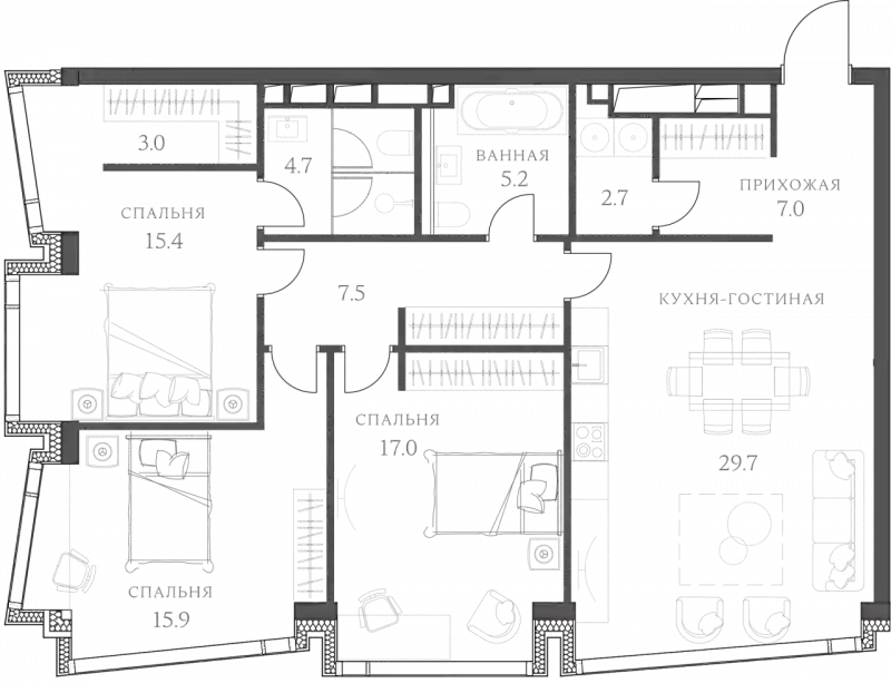 Нижняя часть здания «AHEAD» отведенная под офисы, а верхняя часть — апартаменты. Всего предложено 62 номера. Сдаются они с подчистовой и чистовой отделкой, панорамными окнами и высотой потолков 3,2 метра. Из окон открываются прекрасные виды на Парк Победы и Воробьевы горы.