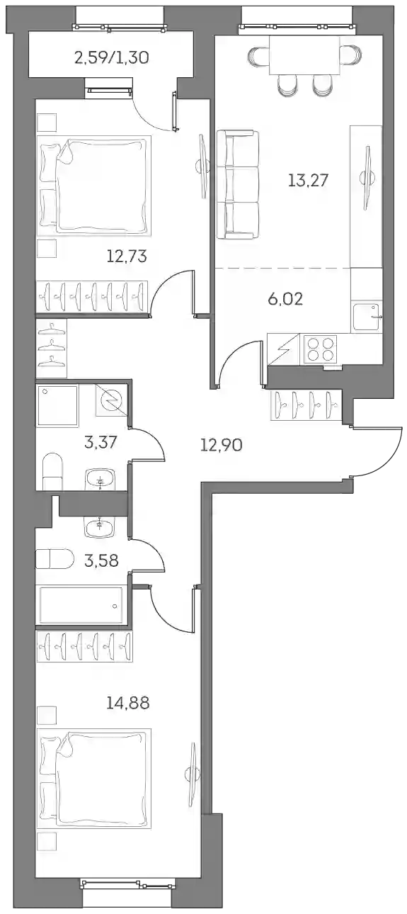 3-к.квартира, 66.75 м², 14 эт. в ЖК Аквилон Beside 2.0 Корпус 1