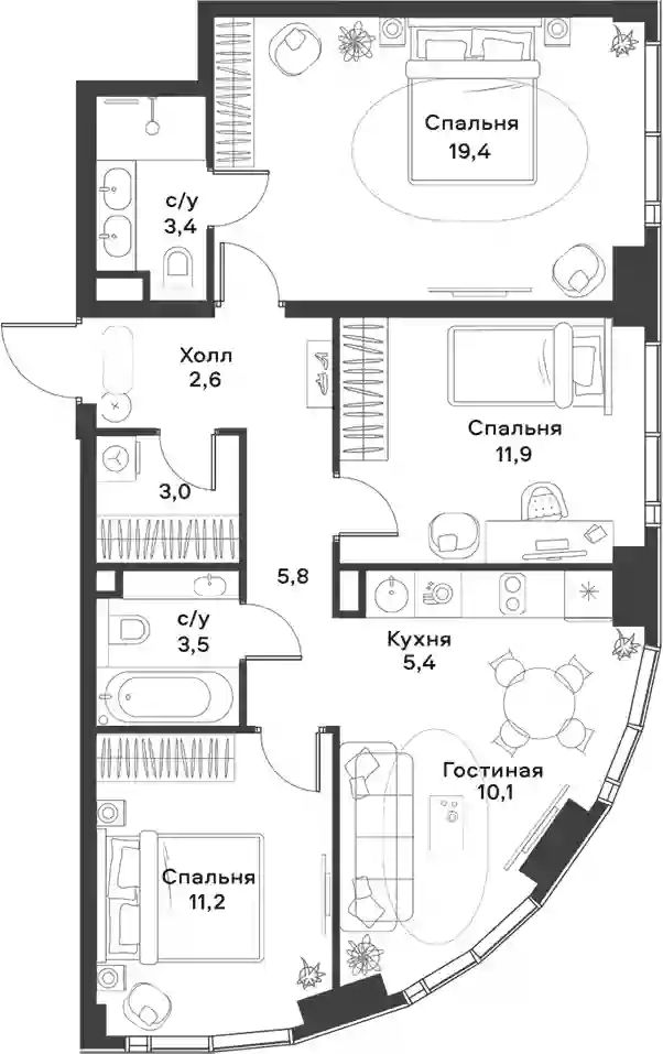 35 184 240 ₽3-к.квартира, 72.8 м², 19 эт.