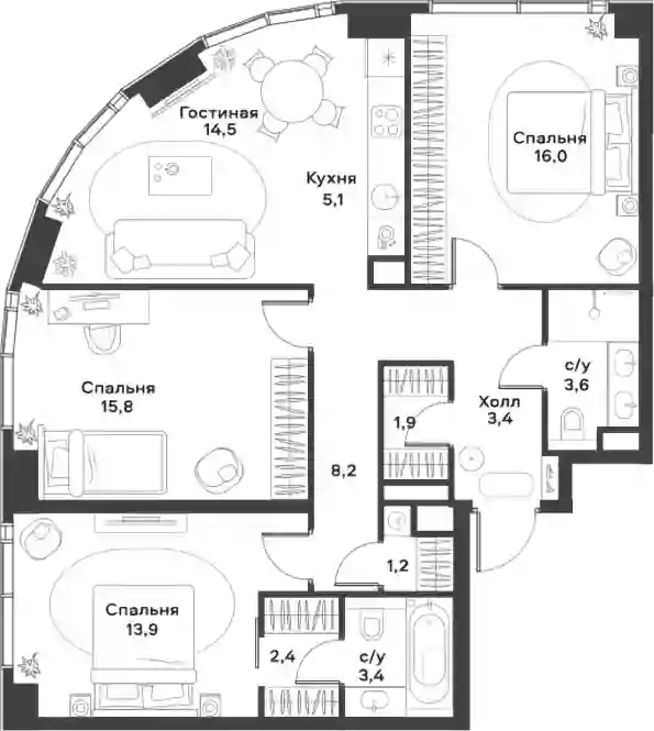 4-к.квартира, 89.4 м², 33 эт. в ЖК ALIA Корпус 1 оч.4
