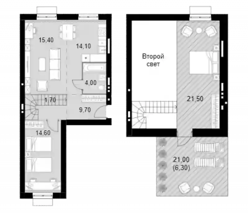 В комплексе предлагаются квартиры с 1–2 комнатами в евроформате с кухней-нишей, а также двухуровневые квартиры с террасой на крыше. Высота потолков в стандартных квартирах составляет 2,68 м, в двухуровневых — 4,78 м. В помещениях установлены увеличенные окна. Жилье передается без межкомнатных перегородок, но с капитальными стенами, входной дверью и остеклением. Подведены коммуникации, электричество заведено до распределительного щитка, установлен котел и радиатор.