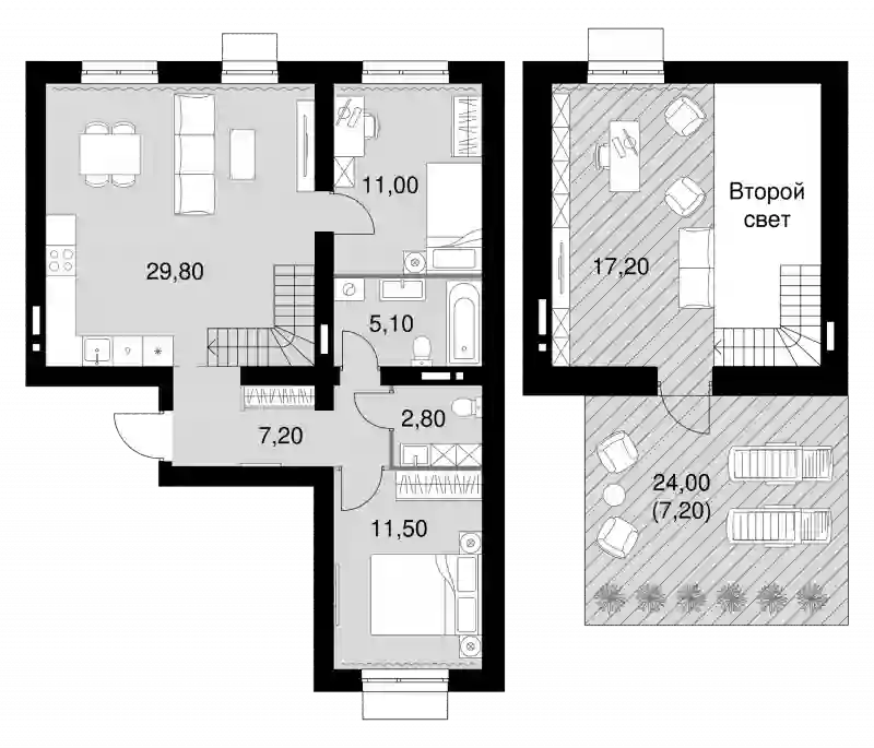 В комплексе предлагаются квартиры с 1–2 комнатами в евроформате с кухней-нишей, а также двухуровневые квартиры с террасой на крыше. Высота потолков в стандартных квартирах составляет 2,68 м, в двухуровневых — 4,78 м. В помещениях установлены увеличенные окна. Жилье передается без межкомнатных перегородок, но с капитальными стенами, входной дверью и остеклением. Подведены коммуникации, электричество заведено до распределительного щитка, установлен котел и радиатор.