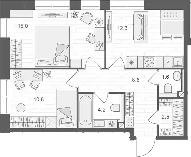 В проекте представлен широкий выбор планировочных решений: от студий до 4-комнатных евро-формата. В каждом доме всего по 82 квартиры. Есть квартиры с собственными террасами и лоджиями. А из квартир второго этажа есть прямой выход на открытую общественную террасу. Площадь квартир варьируется от 24,9 до 90 кв. метров. Высота потолков — до 3,7 метра. Квартиры в одном из корпусов сдаются c дизайнерской отделкой из материалов премиального качества и сантехникой. Во втором корпусе квартиры будут доступны в черновой отделке.