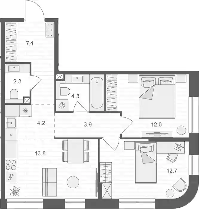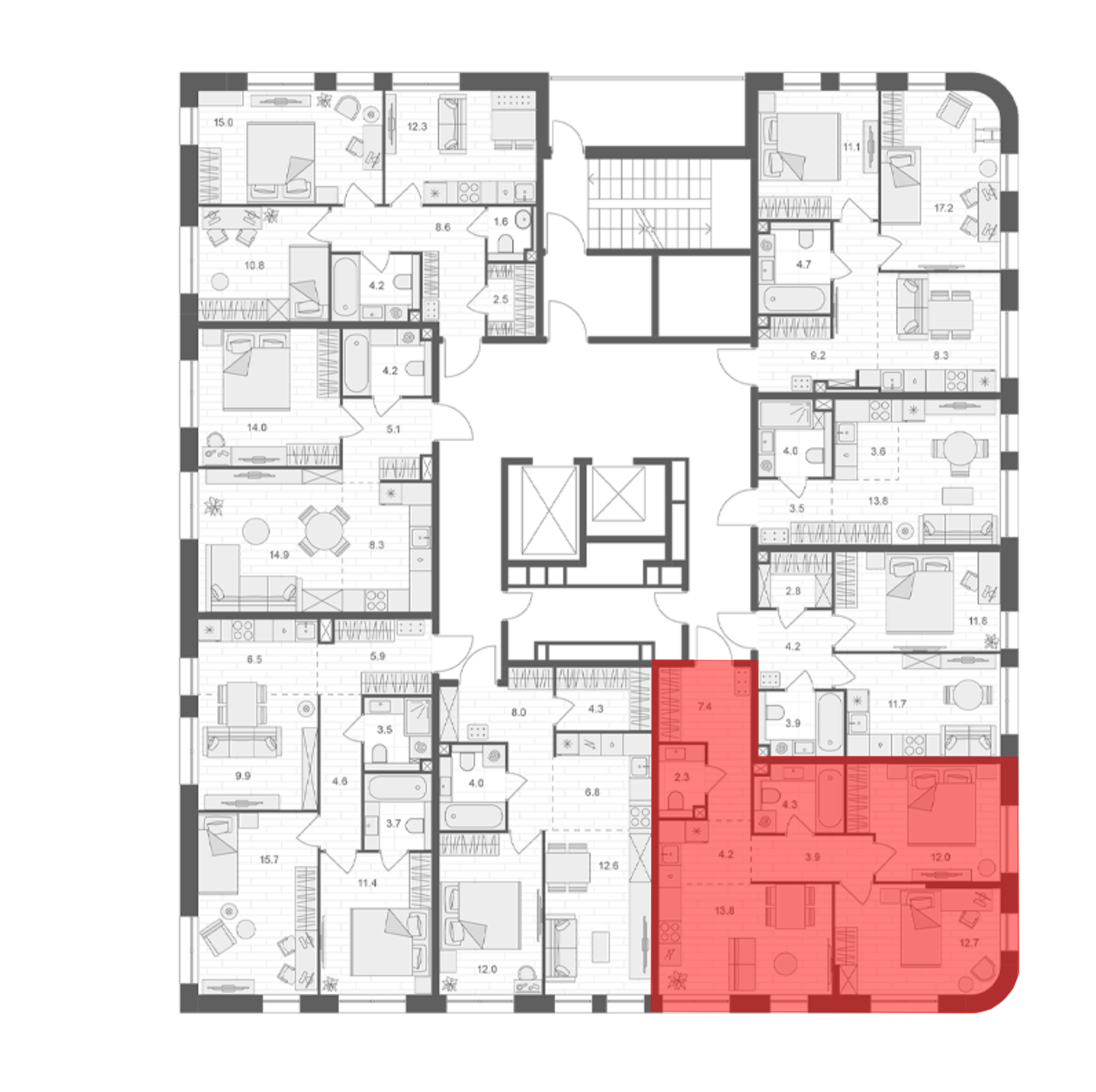 В проекте представлен широкий выбор планировочных решений: от студий до 4-комнатных евро-формата. В каждом доме всего по 82 квартиры. Есть квартиры с собственными террасами и лоджиями. А из квартир второго этажа есть прямой выход на открытую общественную террасу. Площадь квартир варьируется от 24,9 до 90 кв. метров. Высота потолков — до 3,7 метра. Квартиры в одном из корпусов сдаются c дизайнерской отделкой из материалов премиального качества и сантехникой. Во втором корпусе квартиры будут доступны в черновой отделке.