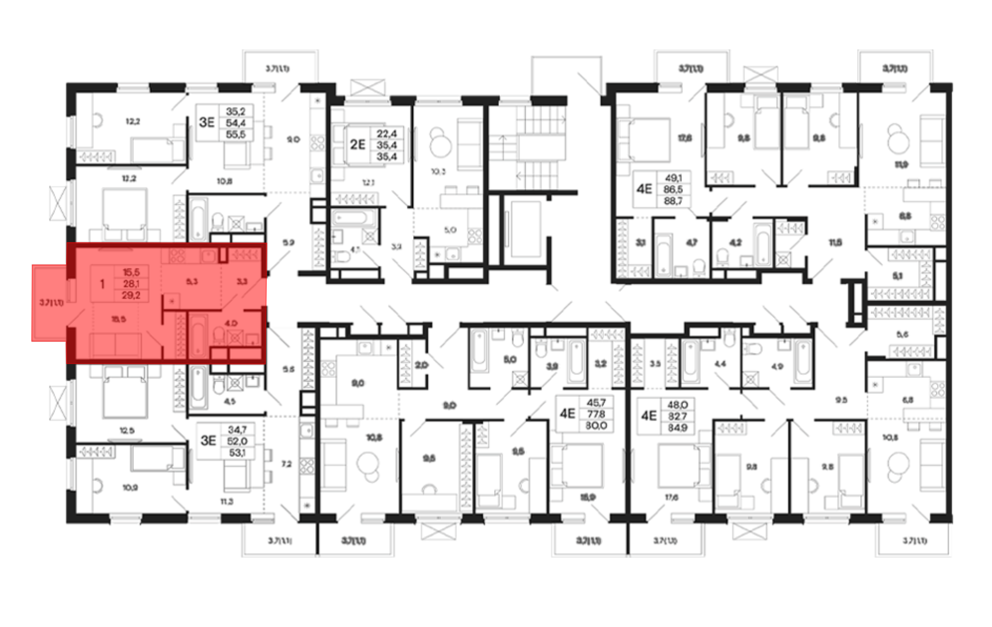 В проекте предлагается всего 95 квартир: студии и квартиры евроформата с 1–3 комнатами и кухней-гостиной. Площадь жилья варьируется от 28 до 92 кв. м. В помещениях установлены увеличенные окна на 2–5 этажах и панорамные на 1 этаже. Высота потолков варьируется от 2,72 до 4,22 м. Предусмотрены планировки с балконами и открытыми террасами. Квартиры передаются без стен, что позволяет владельцам создать индивидуальное пространство.