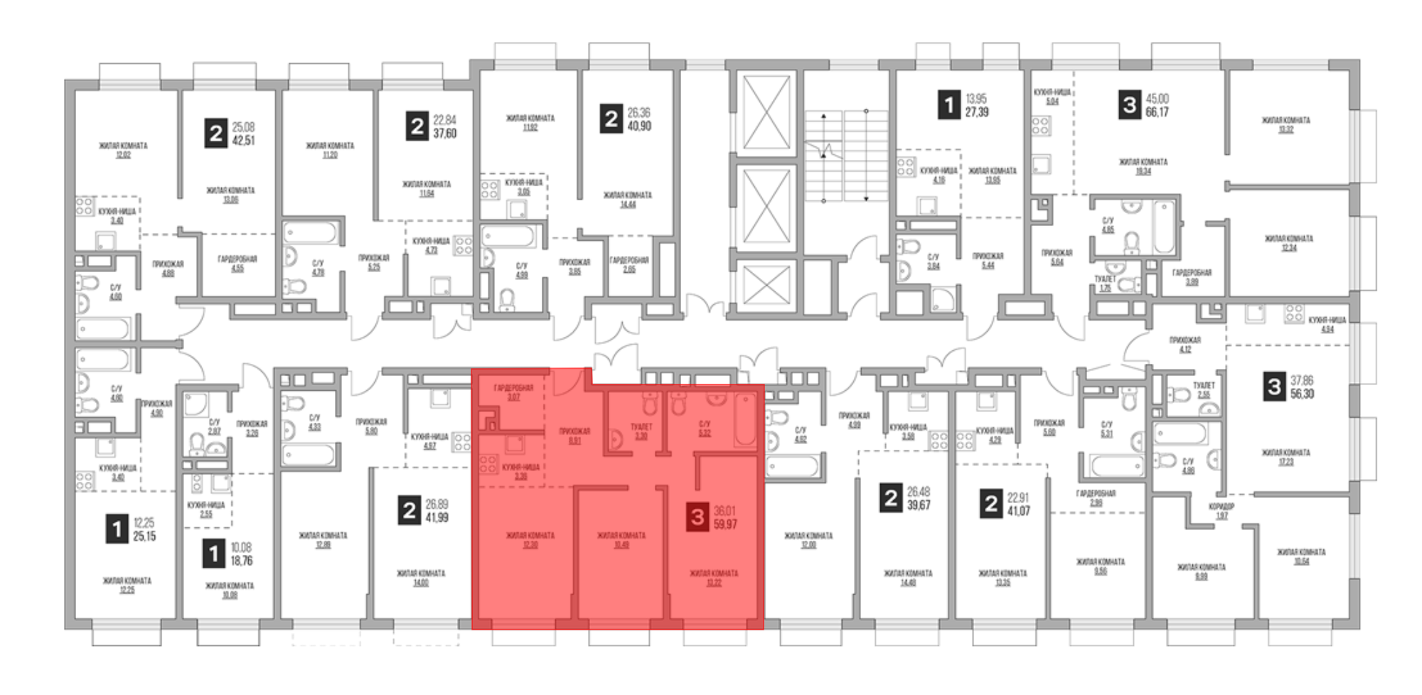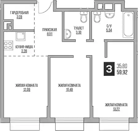3-к.квартира, 59.92 м², 4 эт. в ЖК BeLuck Коломенское Корпус 1.1