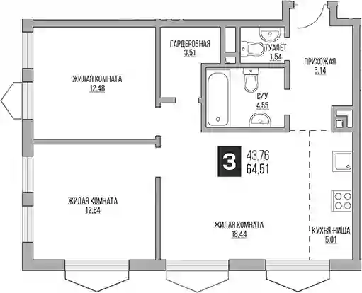 3-к.квартира, 64.51 м², 5 эт. в ЖК BeLuck Коломенское Корпус 1.1