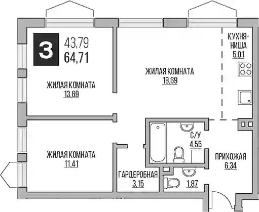 3-к.квартира, 64.71 м², 2 эт. в ЖК BeLuck Коломенское Корпус 1.1 секции 4, 5