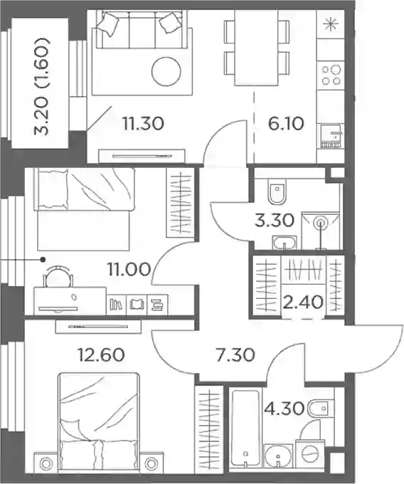 В проекте представлено множество планировочных решений — от студий до просторных 4х-комнатных квартир. Все лоты сдаются с базовой отделкой, высотой потолков до 3,16 метров и стандартными окнами. Предусмотрены квартиры с мастер-спальнями и гардеробными.