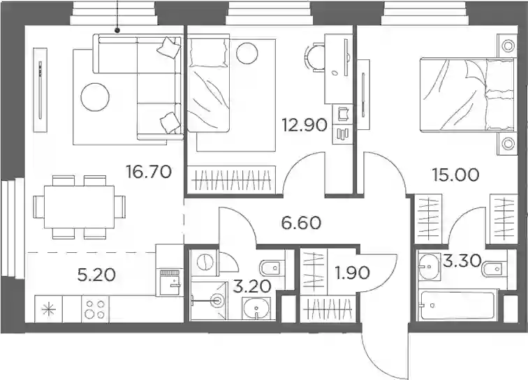 В проекте представлено множество планировочных решений — от студий до просторных 4х-комнатных квартир. Все лоты сдаются с базовой отделкой, высотой потолков до 3,16 метров и стандартными окнами. Предусмотрены квартиры с мастер-спальнями и гардеробными.