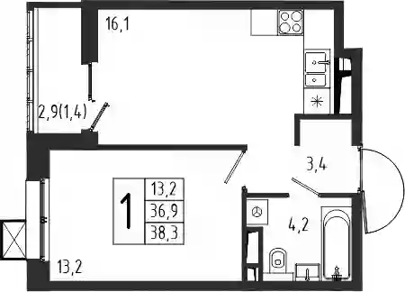 6 213 857 ₽1-к.квартира, 36.9 м², 1 эт.