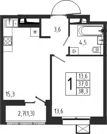 6 213 857 ₽1-к.квартира, 36.9 м², 1 эт.