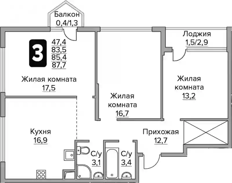 23 257 647 ₽3-к.квартира, 86.6 м², 3 эт.