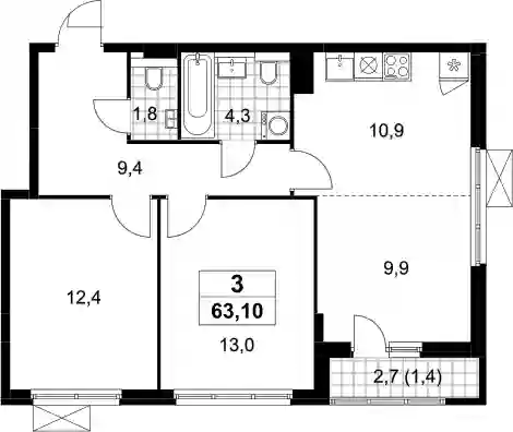 3-к.квартира, 61.7 м², 17 эт. в ЖК Бунинские кварталы Корпус 9.1
