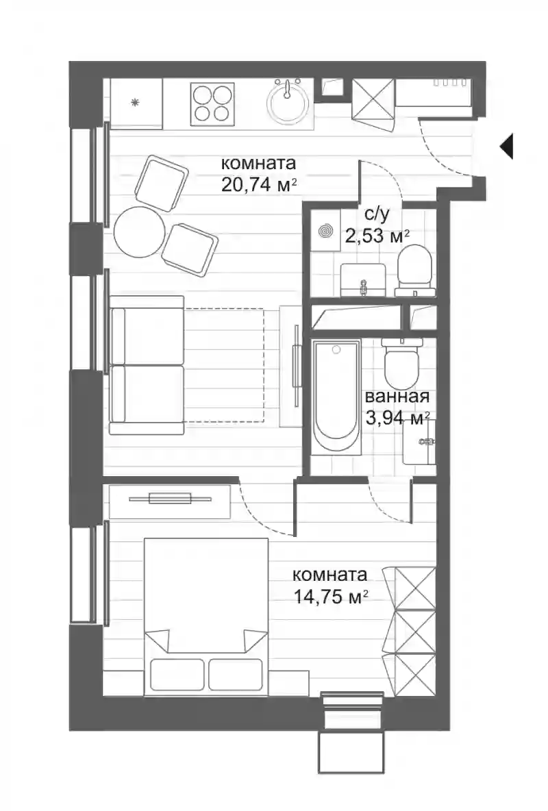 В проекте предложены однокомнатные и двухкомнатные апартаменты площадью от 20 до 45 кв. метров. Есть лоты с эркерами, угловым остеклением и окном в ванной. Все апартаменты сдаются с чистовой отделкой в бежевом или сером тоне.