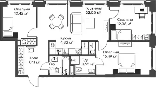 В комплексе представлены квартиры с 1–3 спальнями и таунхаусы. Квартиры сдаются с предчистовой отделкой MR BASE, что позволяет сконцентрироваться на создании интерьера под свой стиль. В квартирах установлены системы «Умная квартира» с контролем освещения и отопления, а также предусмотрена защита от протечек.