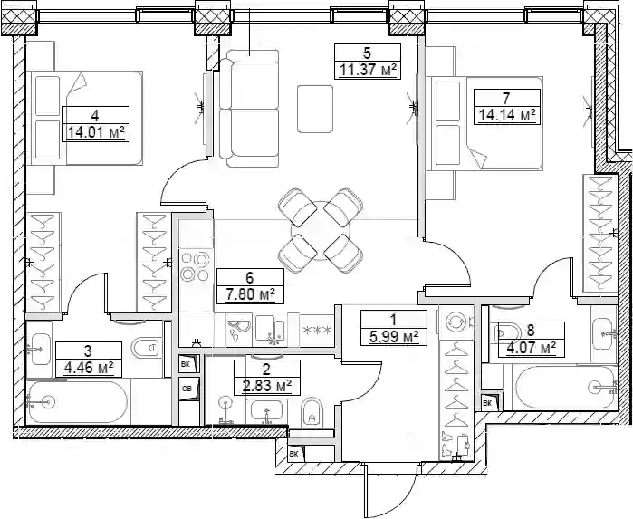 В комплексе предложено множество планировочных решений: в наличии квартиры, как классического типа, так и европланировки. Квартиры сдаются с подчистовой отделкой, высотой потолков 3 м и панорамным остеклением в пол.