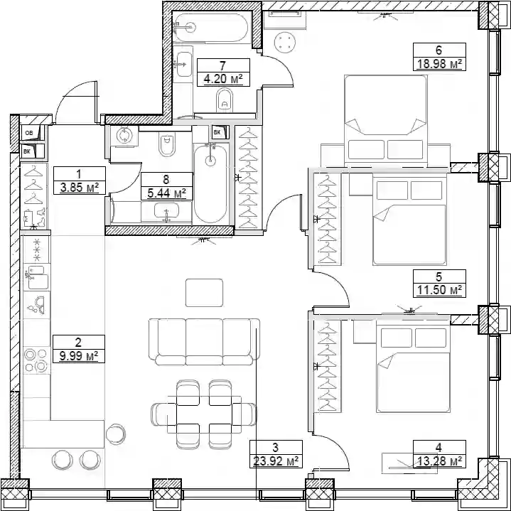 В комплексе предложено множество планировочных решений: в наличии квартиры, как классического типа, так и европланировки. Квартиры сдаются с подчистовой отделкой, высотой потолков 3 м и панорамным остеклением в пол.