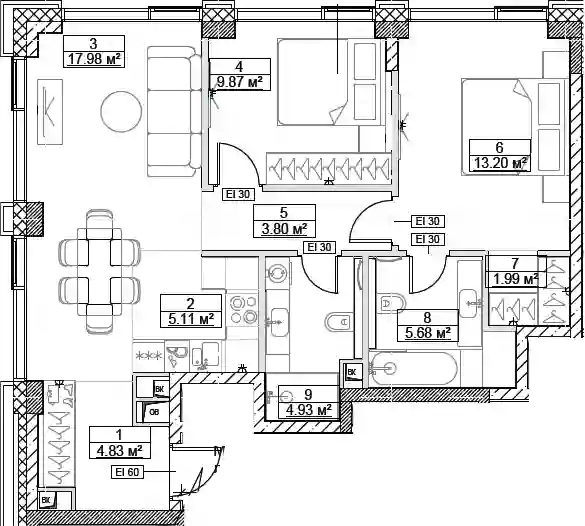В комплексе предложено множество планировочных решений: в наличии квартиры, как классического типа, так и европланировки. Квартиры сдаются с подчистовой отделкой, высотой потолков 3 м и панорамным остеклением в пол.