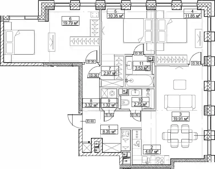 В комплексе предложено множество планировочных решений: в наличии квартиры, как классического типа, так и европланировки. Квартиры сдаются с подчистовой отделкой, высотой потолков 3 м и панорамным остеклением в пол.