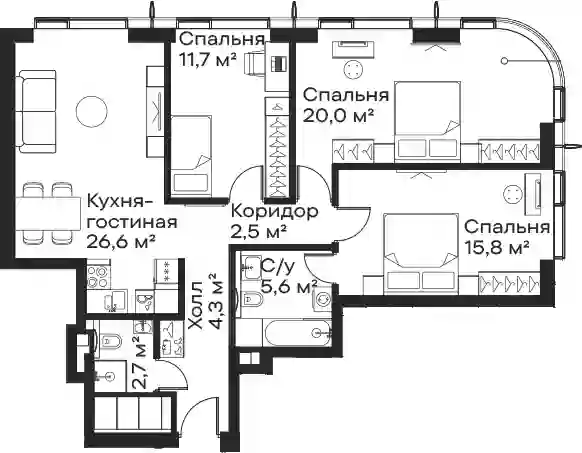 24 706 738 ₽3-к.квартира, 61.1 м², 8 эт.